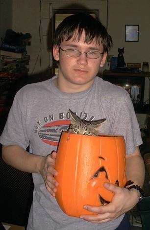 A little Halloween fun: Joe put Stormy inside an empty trick-or-treat bucket. Only her ears and eyes are showing! Taken October 29 at 2:41 p.m.