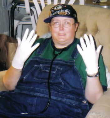 Wendi dressed up as an old country doctor, in bib overalls and a Packer cap, with a stethoscope and surgical gloves.