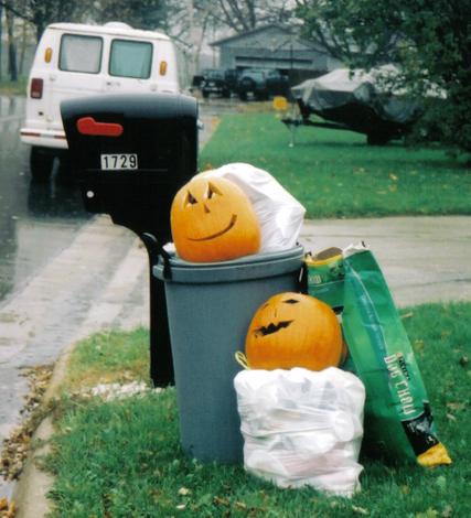 Last smiles: Two spent jack-o’-lanterns grin lazily from atop the garbage set out for collection at this house (Taken November 1).