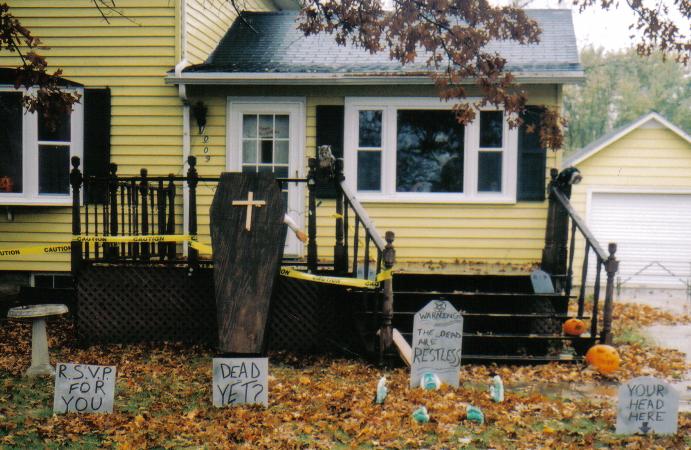 Four gravestones are the centerpiece of this display on Blackbridge Road. They read as follows: