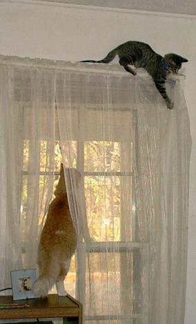 Sunny reaches up toward Stormy as she begins to climb down from the top of the curtain rod. Taken October 14 at 1:18 p.m.