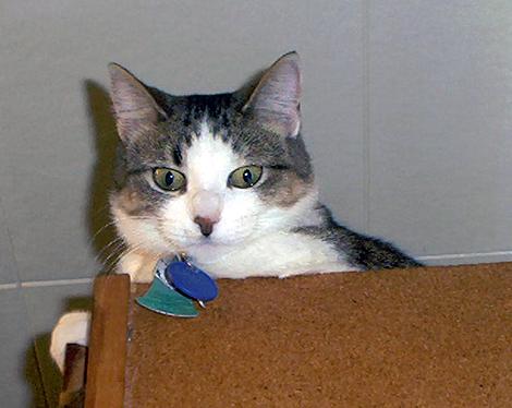 Here is Shadow again on top of the kitchen cabinet, from a different angle. (October 6 at 7:24 p.m.)