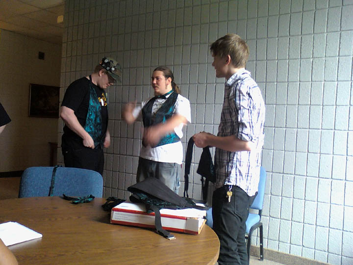 10:21 a.m. Josh Jewell, Alex Jeffcoat and Jason Moe try on the vests they will wear in the wedding.