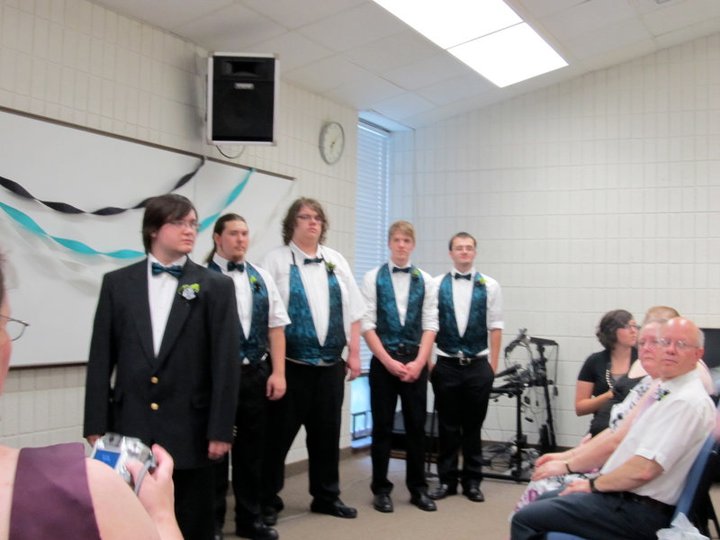 During the wedding. From left: Joe Petitt (Groom), Alex Jeffcoat, John Ulbrech, Jason Moe, Andrew Trader (Groomsmen). Also visible: Charlie and Wendi Petitt (Parents of the Groom), Amanda Aucoin (Photographer)