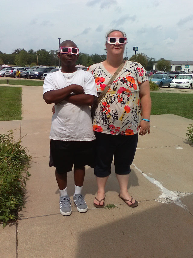Terry (Trey) Moore and Kayla Cleasby, our neighbors and close friends, wearing their protective eclipse glasses, at 12:13 pm. This was less than half an hour into the partial phase, still early.