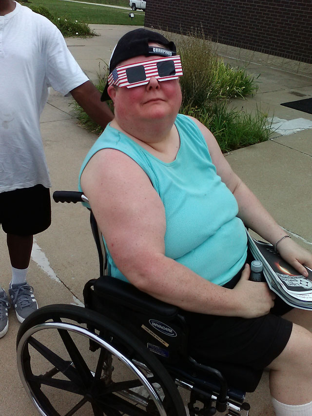 Wendi in her wheelchair, with her eclipse glasses on, watching the sun get covered by the moon’s shadow. Taken at 12:31 pm, about halfway through the partial phase.