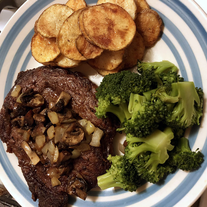 May 10: Mother’s Day dinner was served at 9 pm: rib eye steaks on the broiler, Kharlie fries with homemade herb dip, and fresh broccoli (boiled, with butter and salt).