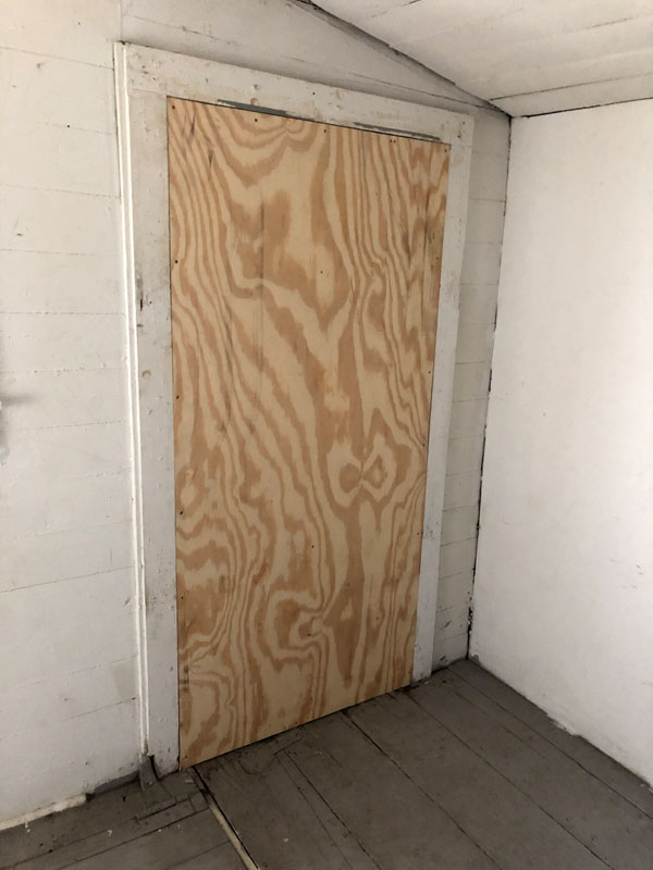 They have just boarded over the rear door of the house which is never used (we have two other entrance doors, and the house is small). Soon after this, they painted this over. (August 17)