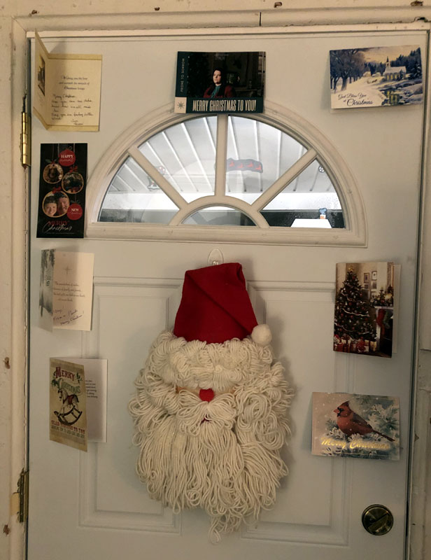 Christmas cards and a Santa on the front door, inside. (December 24)