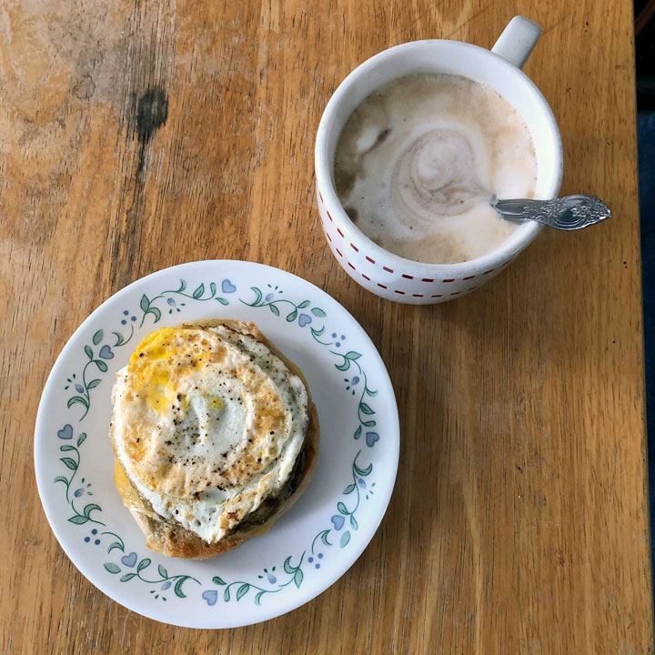 February 17: I started my birthday with an open faced breakfast sandwich and a Kharlie M cappuccino.