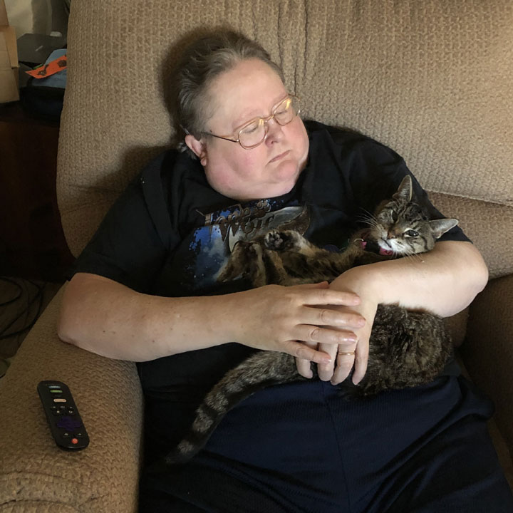 Stormy was mainly calm, only letting out weak squawks or “mmms,” occasionally purring weakly… though at one point she managed to scratch Wendi’s arm.