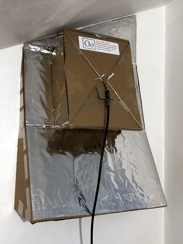 Over the last couple of years, I’ve constructed many homemade TV antennas using aluminum foil, wire, cardboard, glue, and twist ties. I wouldn’t dream of using most of these materials outdoors! But the four antennas you’ll see here get us 12 stations and over 60 channels from Madison, Wisconsin (35 miles away by air) and Rockford, Illinois (27 miles away). A switch is used to receive either Rockford UHF, or Madison UHF along with VHF.