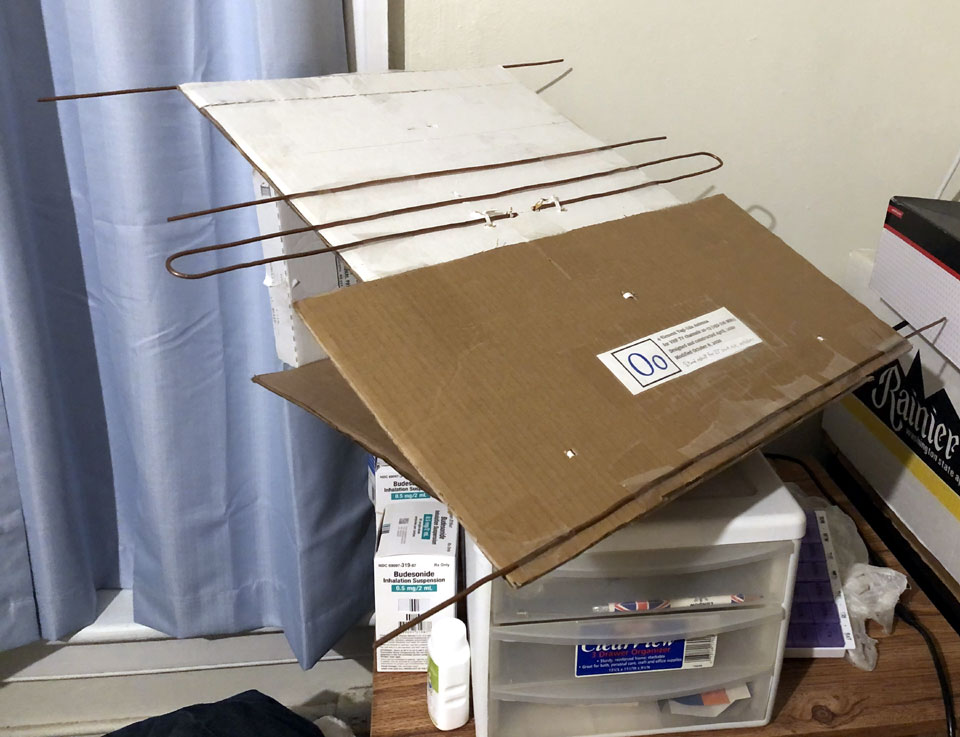 Another four-element VHF Yagi sits near the north window in the master bedroom. This one receives WISC, channel 3 from Madison. For some reason it gets the best reception angled upward, as you see it here.