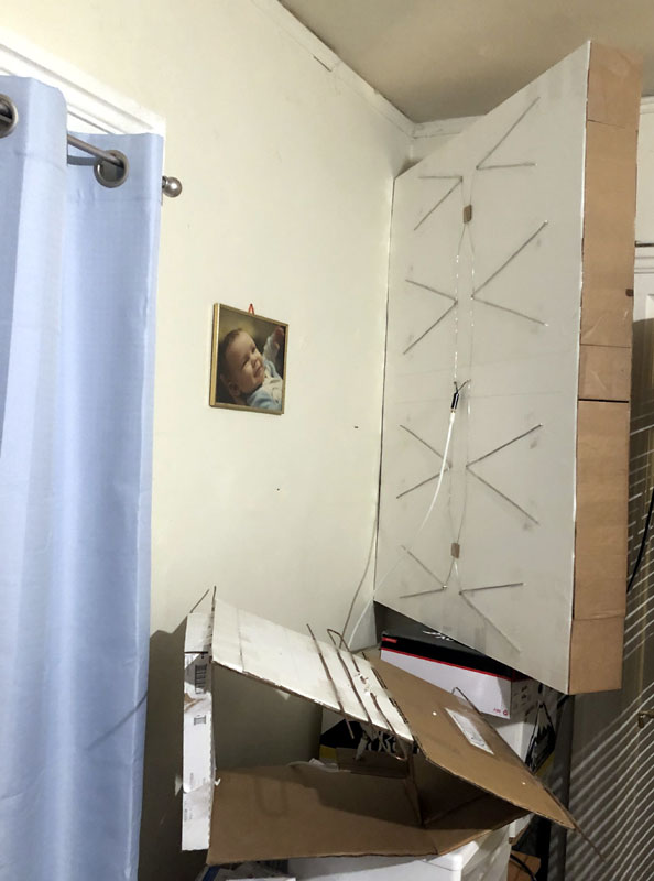 The tall antenna (48 by 36 inches) was constructed on October 14, 2021. I call it the “V8” 4-Bay Bowtie, the “Holy Grail” of UHF Antennas. For anyone who knows this stuff, it gets up to 16 dBi net gain.