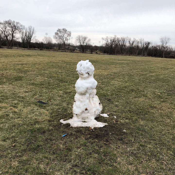 A seemingly out-of-place snowman seen on my walk today. (April 3)