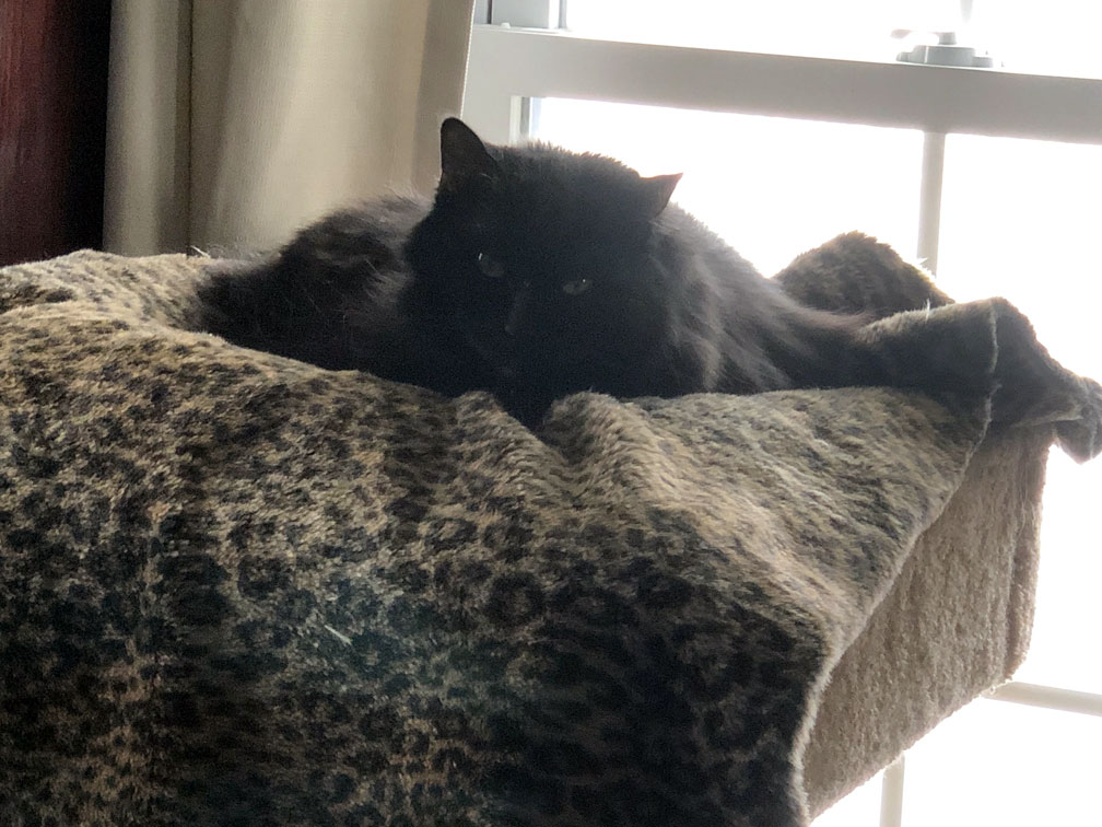 Olivia rests on a blanket atop her cat tree in the living room. (January 15, 11:43 am)