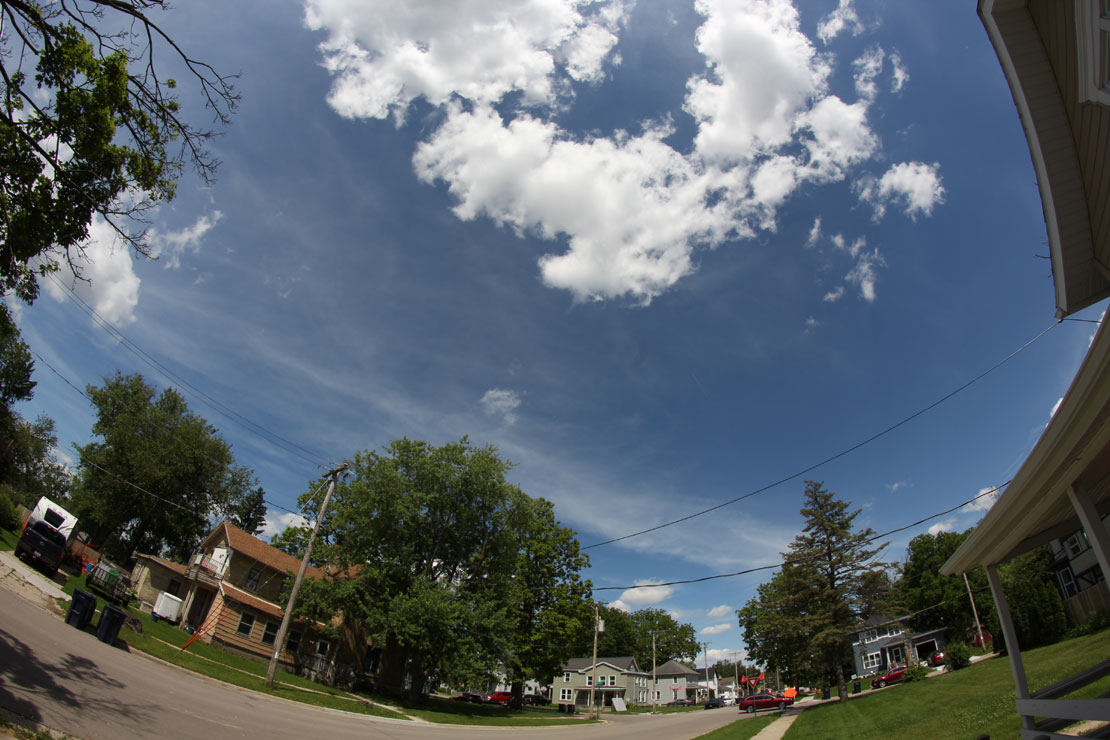 I trained the same fisheye lens on the sky above me, also capturing the houses across the street and down the block, and even a portion of our own house.