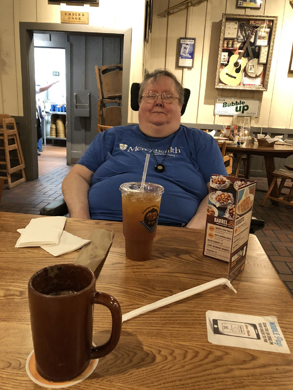 Wendi enjoys a dinner out at Cracker Barrel on September 13, 2022.