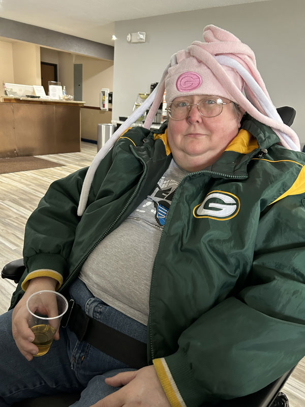Monday, November 7 at about noon: we’ve checked out of the hotel and are waiting in the front room for Joe and Asha to arrive. Wendi is wearing the pink-and-white wig.