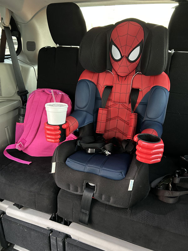 Asha’s Spiderman car seat in our van. She rode with us for today’s outing.