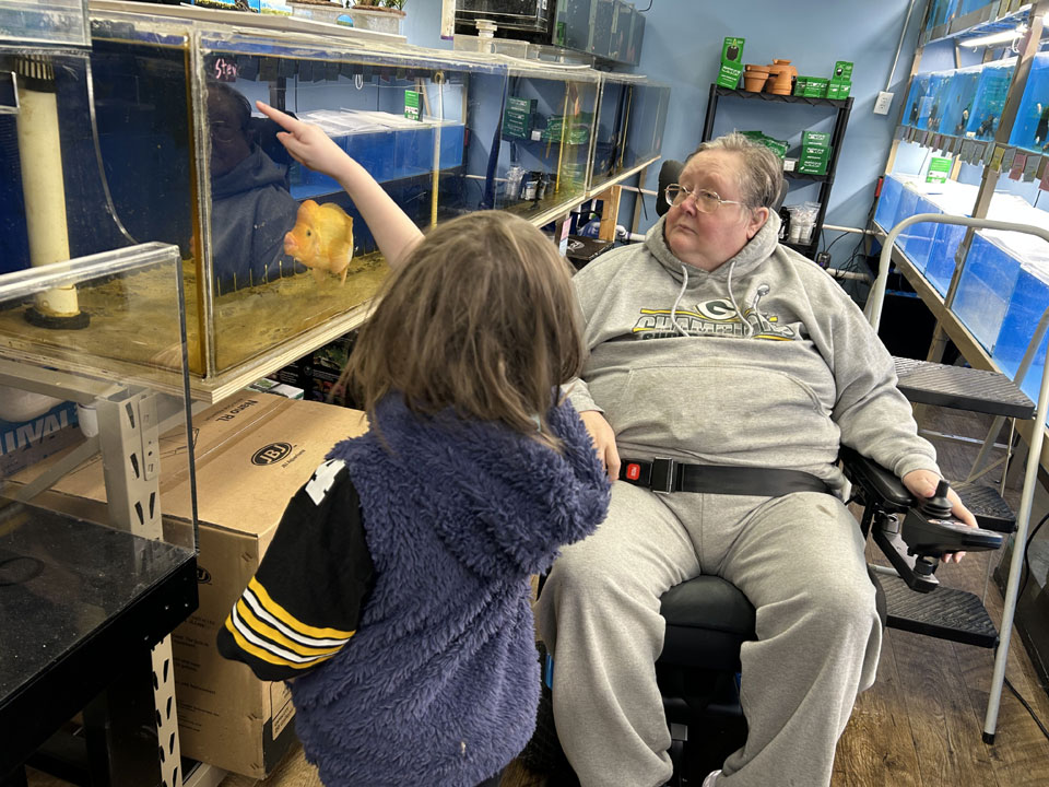 After lunch, we stopped at Pure Fish Works in Hastings so Joe and Elizabeth could buy snails for their turtle tank. Here, Asha and Nana (Wendi) look at some fish.