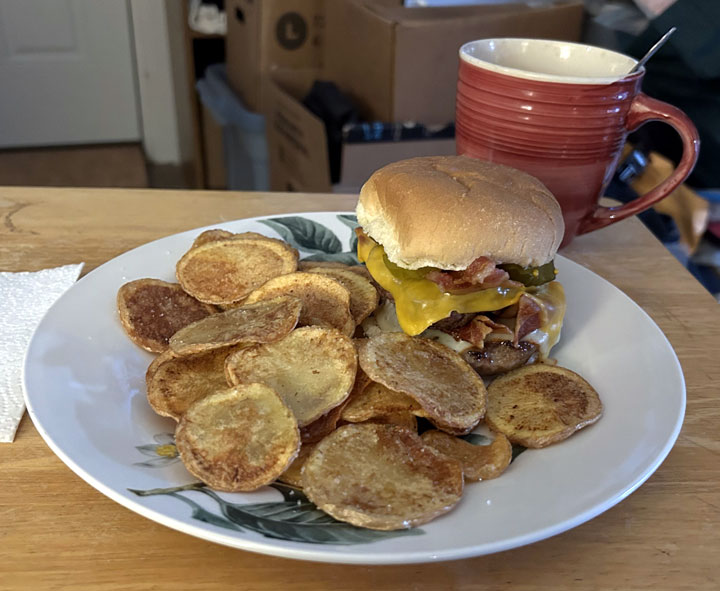December 8: For dinner, at Wendi’s request, I made deluxe burgers with a brat patty, a ground beef patty, two slices of bacon, two slices of cheese (American and Muenster), and sweet pickles. On the side, we had Kharlie fries, which are thinly hand-sliced potatoes fried in a pan. Yum!