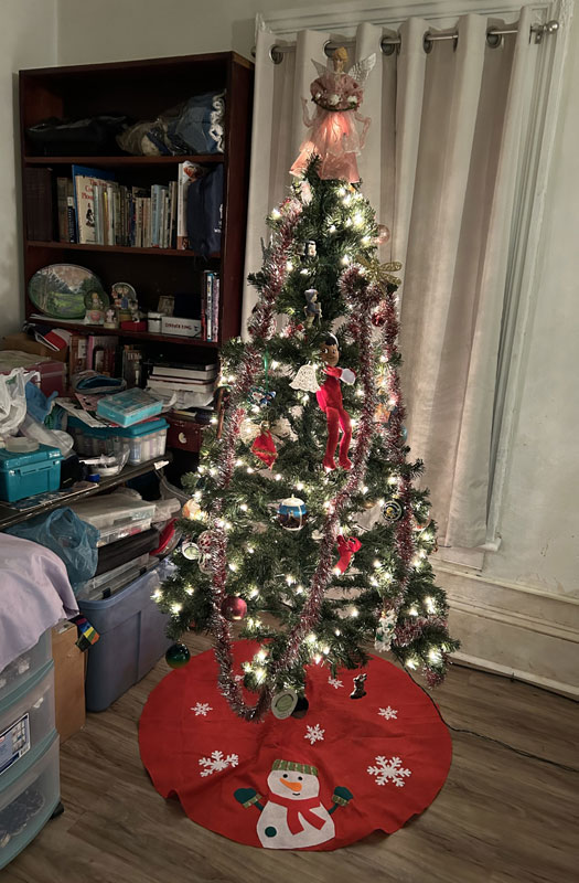Christmas Eve: After 8:00, I put up the Christmas tree (which is very easy), then put on the garland. Craig did most of the ornaments. I put up the red tree skirt with the snowman and snowflakes; normally we don’t use that one.
