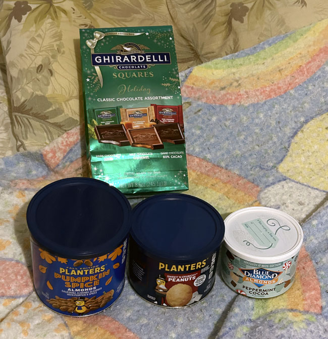 Julie gave us a variety of nuts and Ghirardelli chocolate squares.