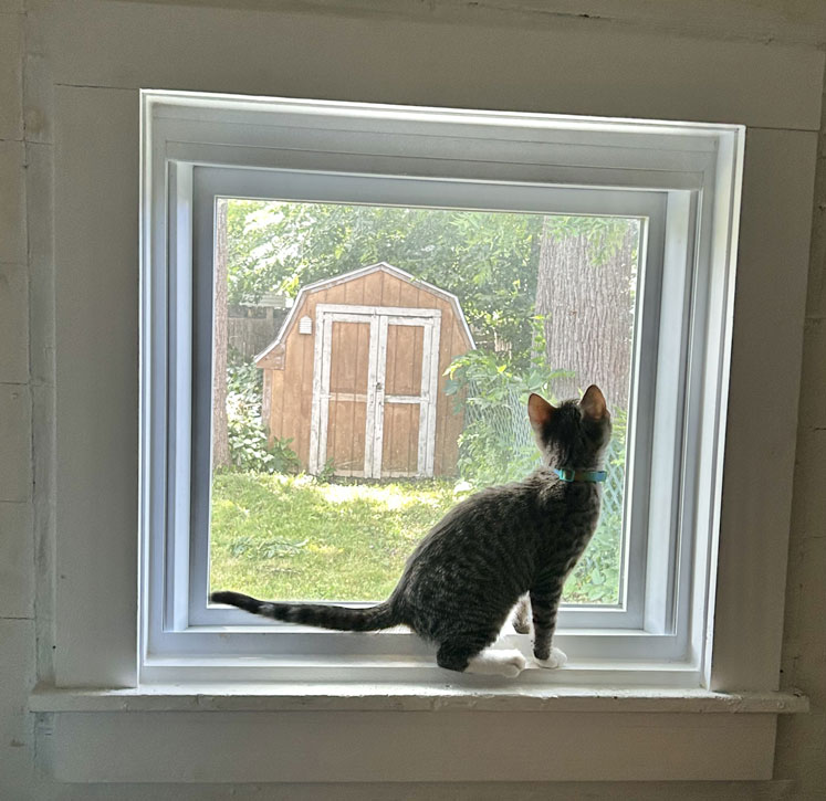Buddy looks out a window in the laundry room. (June 25)