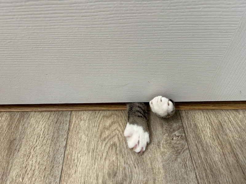 Buddy sticks both front paws under the bathroom door. (October 2)
