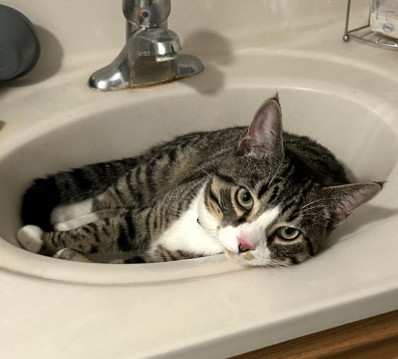 Buddy looking out of the bathroom sink (October 27). Soon after this, we had to stop letting him in there because he started knocking things onto the floor.