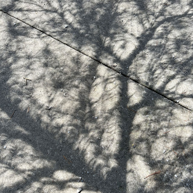 Twenty minutes before totality, the sun dappling through the pine tree left odd shadows on the sidewalk because the sun was now a crescent shape.