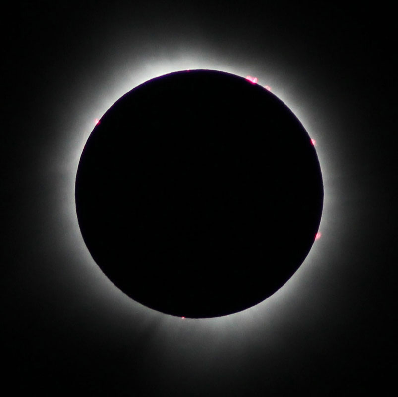 Totality lasted nearly four minutes, from about 2:02 to 2:06 pm. This photo shows bright pink prominences along with the sun’s corona, neither of which are visible except during a total solar eclipse.
