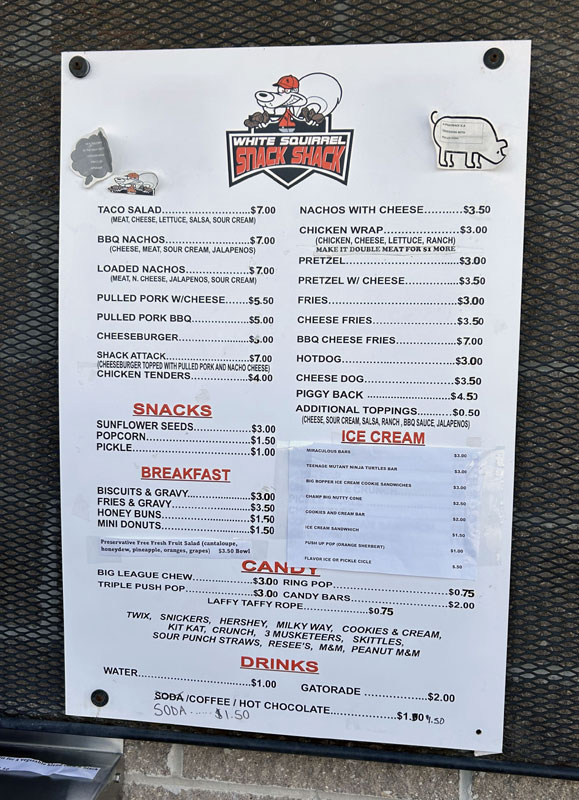 The menu for White Squirrel Snack Shack, where Craig bought our lunch at 11:20 am. The pulled pork sandwiches and French fries were both excellent!