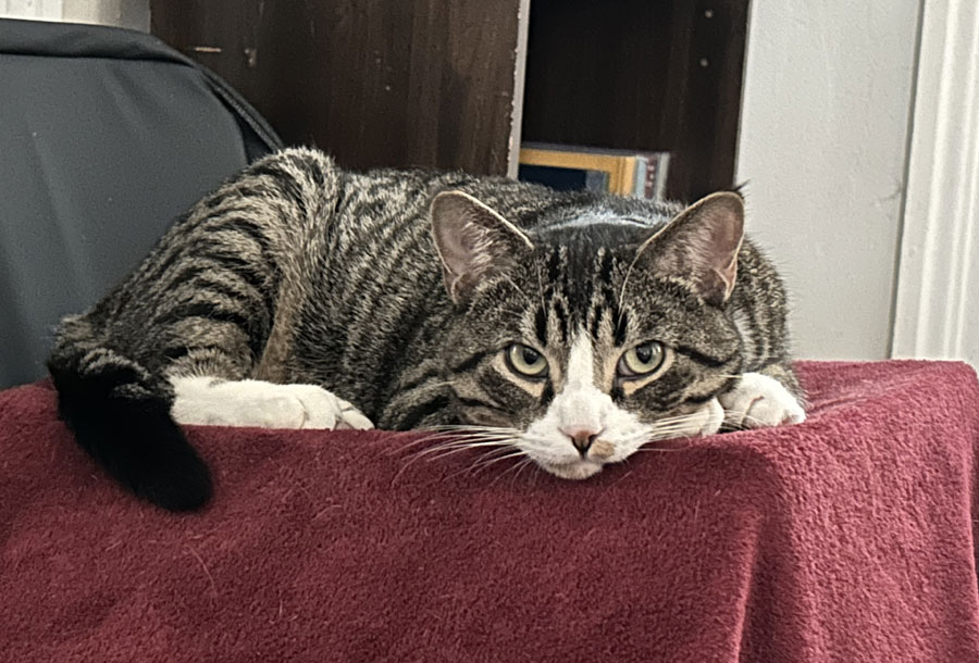 Close-up of Buddy on his bed which consists of a red blanket over a box on top of Wendi’s power wheelchair. (February 28)