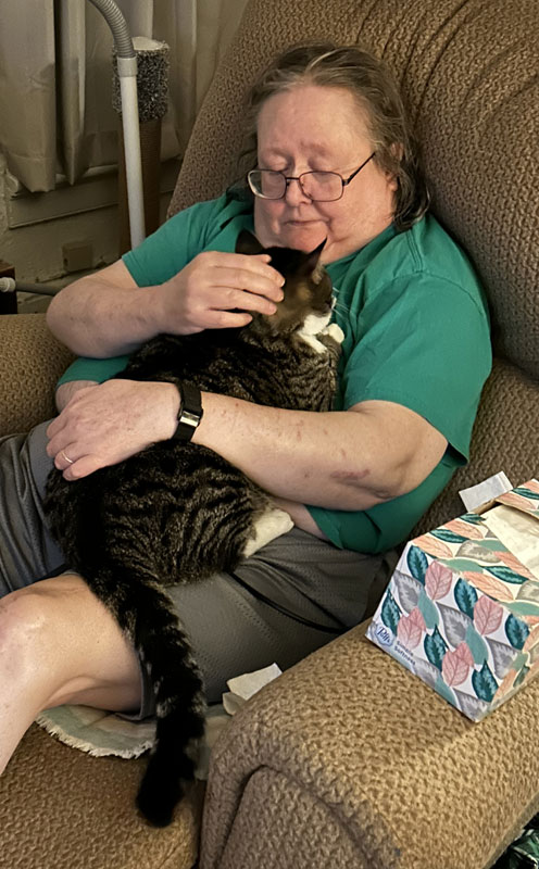 Buddy cuddles with Wendi. (April 30)