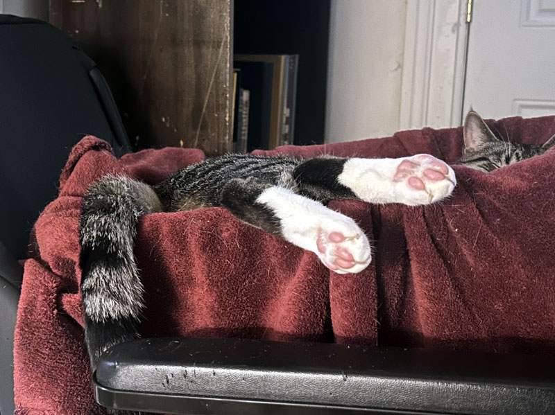 Buddy’s feet and tail hang out of his bed. (June 8)