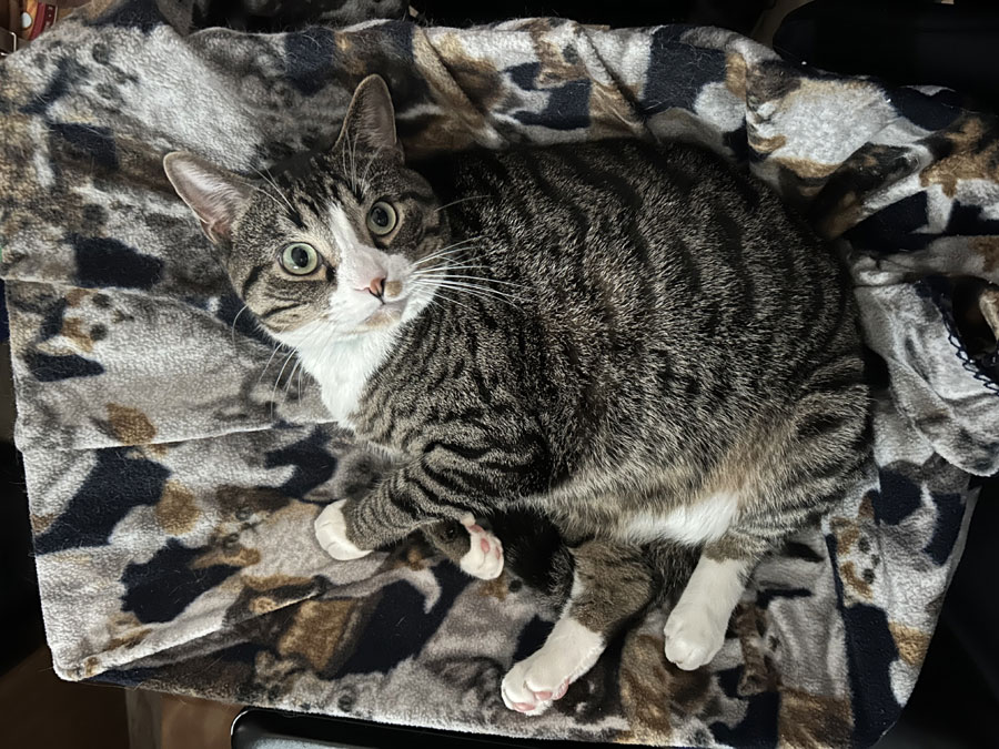 Buddy with his eyes wide open. We switched the blanket in his bed. (August 27)