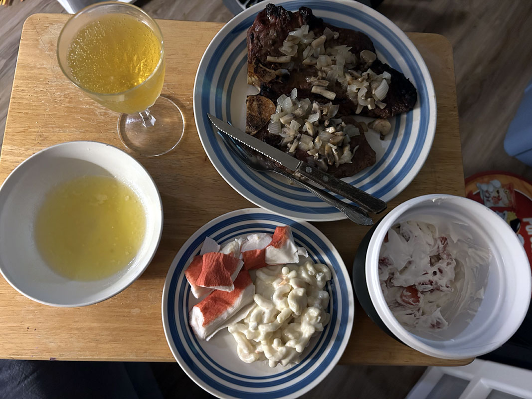 Home cooked dinner on our anniversary: T-bone steaks (marinated in Sun Drop soda and Worcestershire sauce, then seasoned and broiled), topped with fried onions and mushrooms; imitation crab chunks with garlic butter for dipping; store bought macaroni salad, fresh strawberries with sweetener and Cool Whip (served in Bento cups), and Welch’s Sparkling Passion Fruit Mango cocktail.